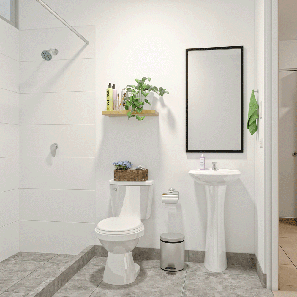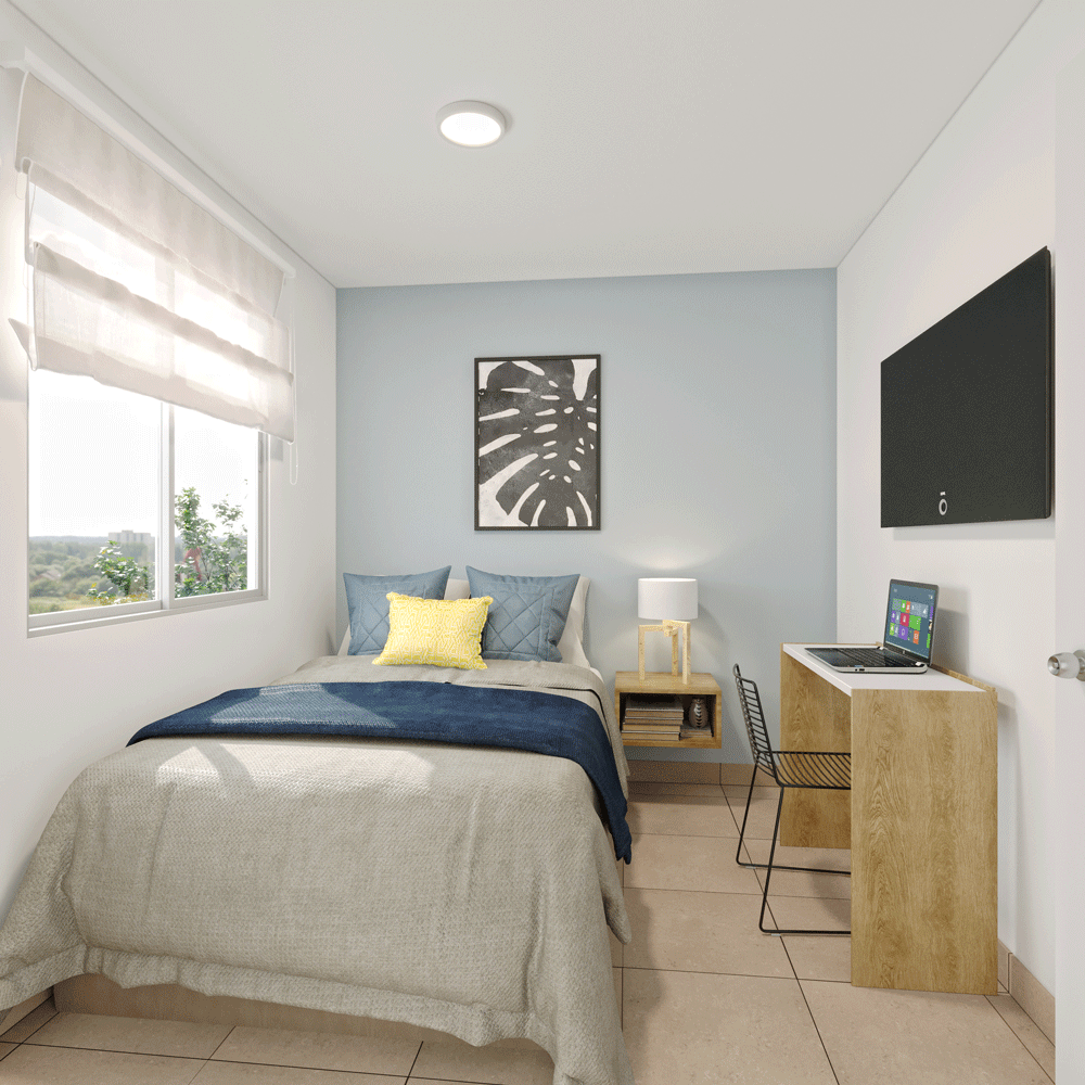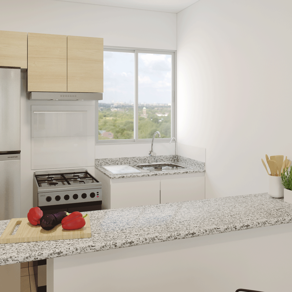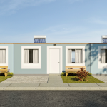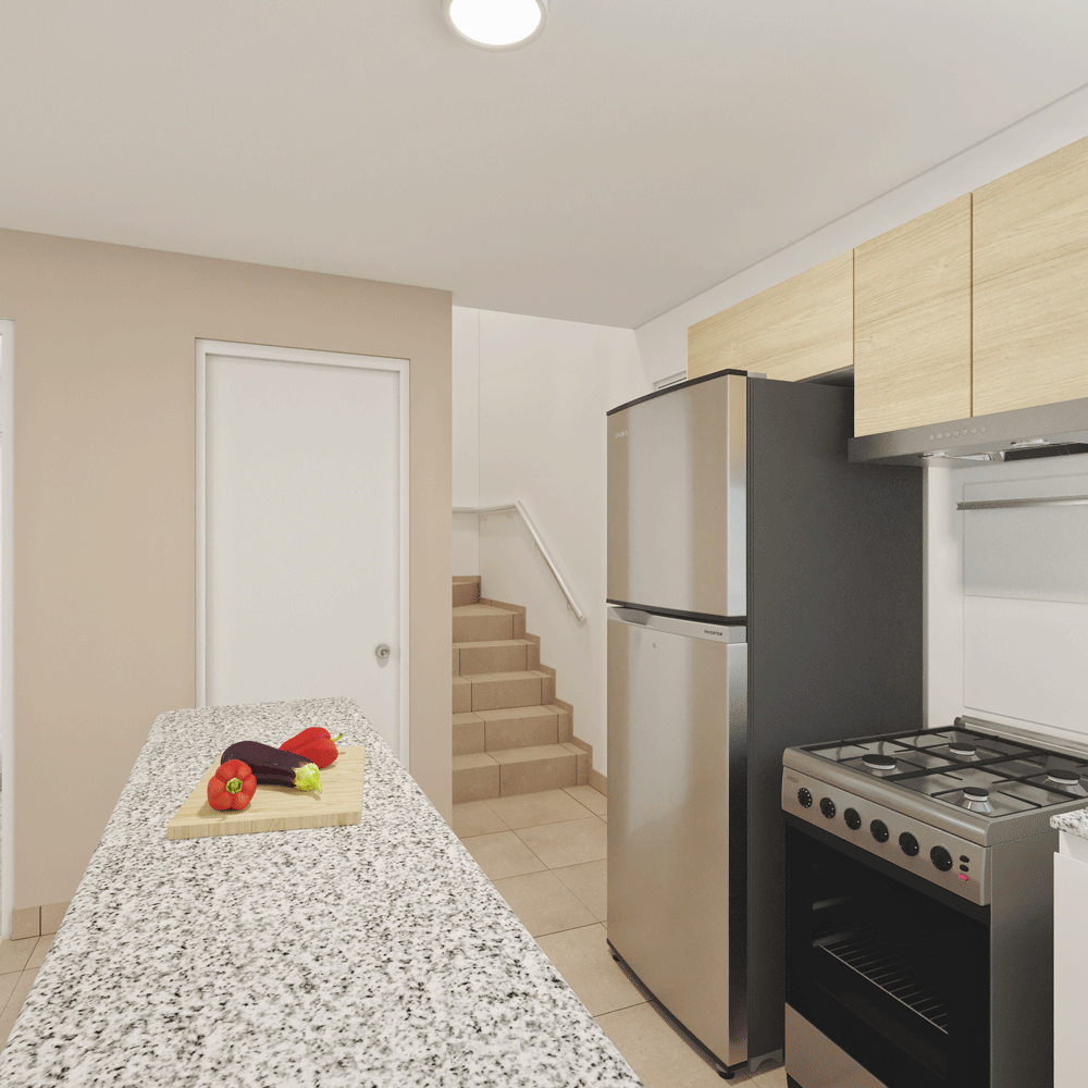 Tu casita también incluye un frontis con jardín, árbol, una banca de material reciclado, 2 LEDS solares, luces LED en el interior, mueble del lavadero, filtro de agua, barra de cocina incluida y terma solar.